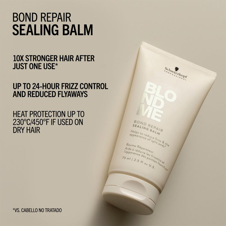 Der BLONDME Bond Repair Sealing Balm mit der BOND REPAIR TECHNOLOGIE versiegelt Spliss und hilft, Frizz zu reduzieren und das Haar zu glätten, sodass es geschmeidig und glänzend aussieht. Bietet einen Hitzeschutz von bis zu 230°C und stärkt das Haar, indem es die inneren Haarverbindungen aufbaut und Haarschäden repariert, die zwei Aufhellungsservices entsprechen - bereits nach nur einer Anwendung.